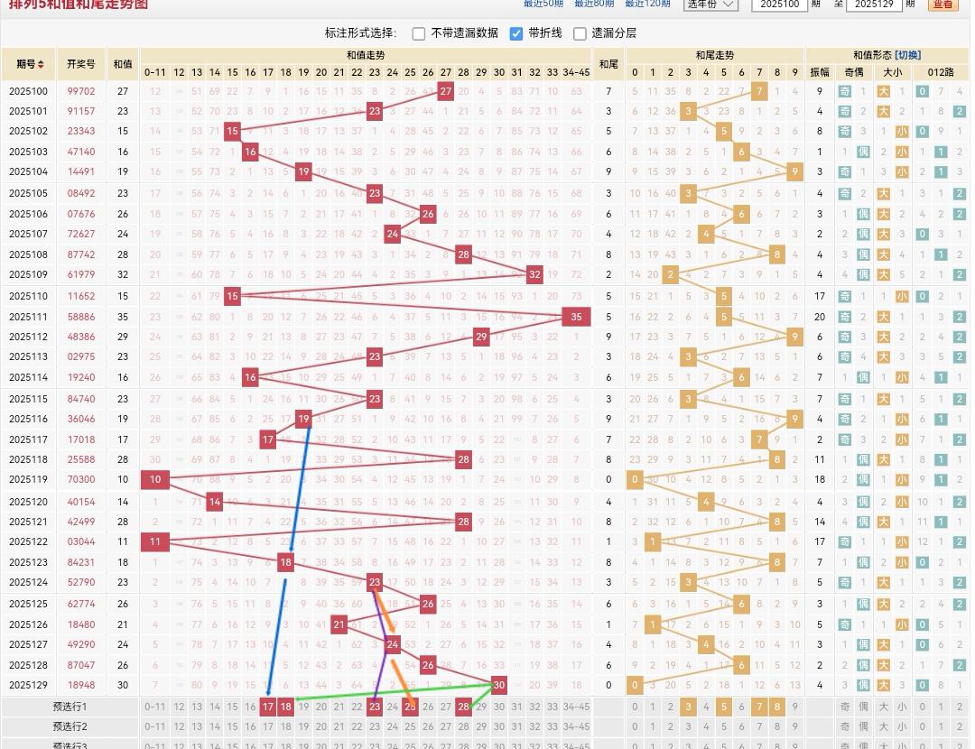 上期开出18948和值30走一个小退格,根据平衡原则近期和值32-15-33-29-23-16-23-19-17-28-10-14-28-11-18-23-26-21-24-26-30,形成梯形斜线,4-5-6-6-4-2-11-18-4-17- 7-5-3- 5-3-2-4振幅,本期考虑中和值范围(19-32)重点考虑,130期个人觉得考虑3578尾。推荐和值 23 28 防17 18 25 28