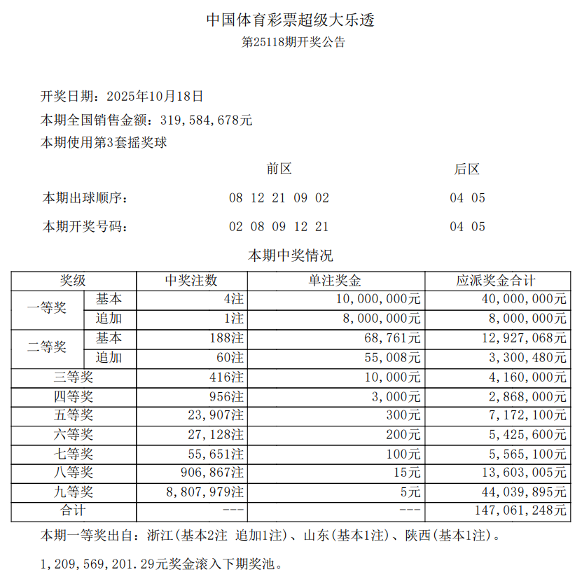 10月18日,超级大乐透第25118期开奖。前区开出号码02、08、09、12、21;后区开出号码04、05。本期全国销售3.19亿元,为国家筹集彩票公益金1.15亿元。