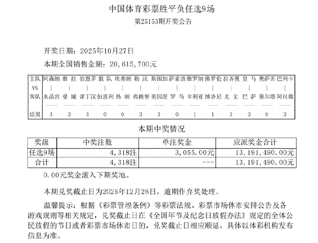 北京时间10月27日,胜负彩第25153期任九开奖结果揭晓。本期任九开出4318注,单注奖金3,055元。本期任九投注总额为20,615,700元。