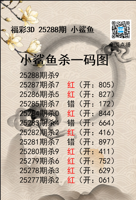福彩3D25288期分析师小鲨鱼杀号图精选 发表于:2025-10-29 16:34:31 浏览次数:770 上一篇:福彩3D25288期码师小贝杀号图精选 下一篇:福彩3D25288期财神送彩杀三码 福彩3D定位5荣誉榜