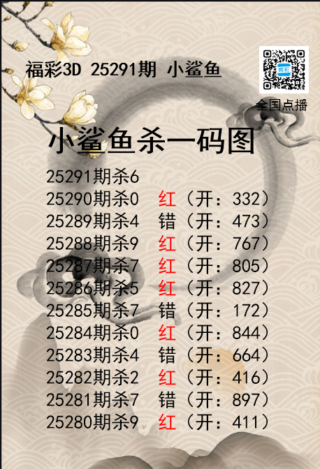 福彩3D25291期分析师小鲨鱼杀号图精选 发表于:2025-11-01 16:37:51 浏览次数:800 上一篇:福彩3D25291期码师小贝杀号图精选 下一篇:福彩3D25291期财神送彩杀三码 福彩3D定位5荣誉榜