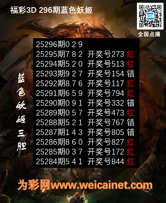 福彩3D25296期胆码 蓝色妖姬胆码图