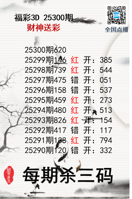 福彩3D25300期财神送彩杀三码 发表于:2025-11-10 17:26:52 浏览次数:786 上一篇:福彩3D25300期分析师小鲨鱼杀号图精选 下一篇:福彩3D25300期龙虎斗胆码 杀码图 福彩3D定位5荣誉榜