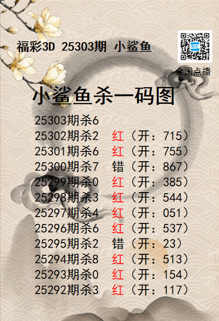 福彩3D25303期分析师小鲨鱼杀号图精选 发表于:2025-11-13 13:32:14 浏览次数:382 上一篇:福彩3D25303期码师小贝杀号图精选 下一篇:福彩3D25303期财神送彩杀三码 福彩3D定位5荣誉榜