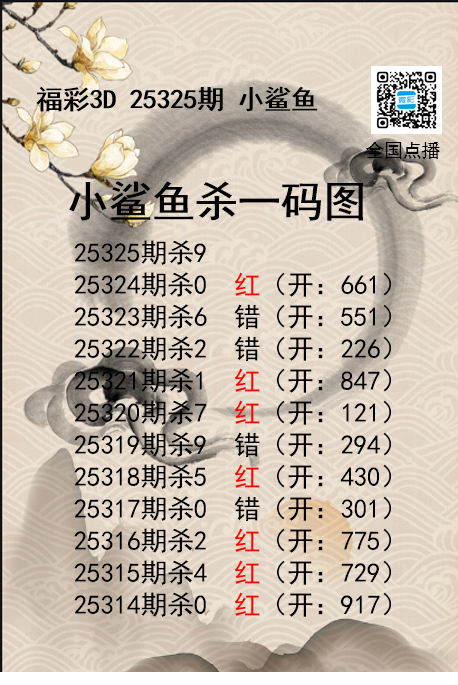 福彩3D25325期分析师小鲨鱼杀号图精选 发表于:2025-12-05 16:25:22 浏览次数:806 上一篇:福彩3D25325期码师小贝杀号图精选 下一篇:福彩3D25325期财神送彩杀三码 福彩3D定位5荣誉榜