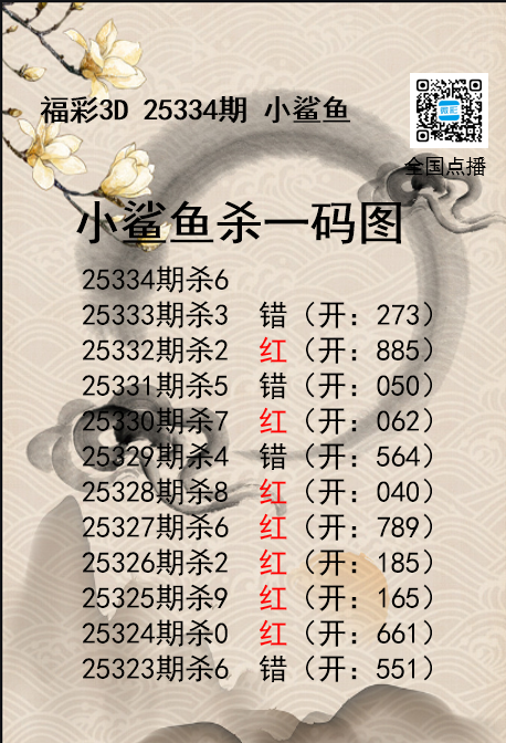福彩3D25334期分析师小鲨鱼杀号图精选 发表于:2025-12-14 16:37:18 浏览次数:830 上一篇:福彩3D25334期码师小贝杀号图精选 下一篇:福彩3D25334期财神送彩杀三码 福彩3D定位5荣誉榜