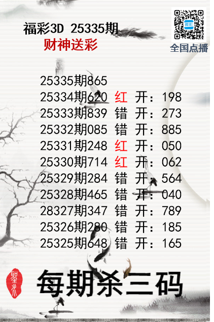 福彩3D25335期财神送彩杀三码 发表于:2025-12-15 18:19:33 浏览次数:838 上一篇:福彩3D25335期分析师小鲨鱼杀号图精选 下一篇:福彩3D25335期龙虎斗胆码 杀码图 福彩3D定位5荣誉榜