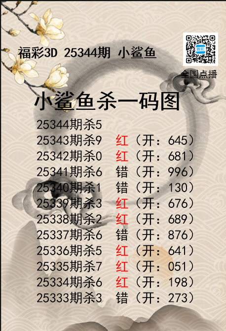 福彩3D25344期分析师小鲨鱼杀号图精 发表于:2025-12-24 15:17:27 浏览次数:479 上一篇:福彩3D25344期码师小贝杀号图精选 下一篇:福彩3D25344期财神送彩杀三码 福彩3D定位5荣誉榜