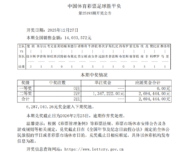 北京时间12月27日,胜负彩第25193期开奖结果揭晓。本期14场头奖空开,二等奖也仅开出2注,单注奖金1,347,222元,6,287,040元奖金滚入下期奖池;任九开出125注79,934元。值得注意的是,134.7万是2025年开出的第二高足彩二等奖金,仅低于第25083期开出的290.2万。此外,134.7万是今年第3次开出百万以上足彩二等,TOP10排名如下: