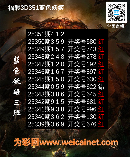 福彩3D25351期胆码 蓝色妖姬胆码图