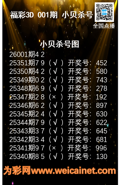 福彩3D26001期码师小贝杀号图精选 发表于:2026-01-01 16:52:51 浏览次数:922 上一篇:福彩3D26001期胆码 蓝电耗子三胆图 下一篇:福彩3D26001期分析师小鲨鱼杀号图精 福彩3D定位5荣誉榜