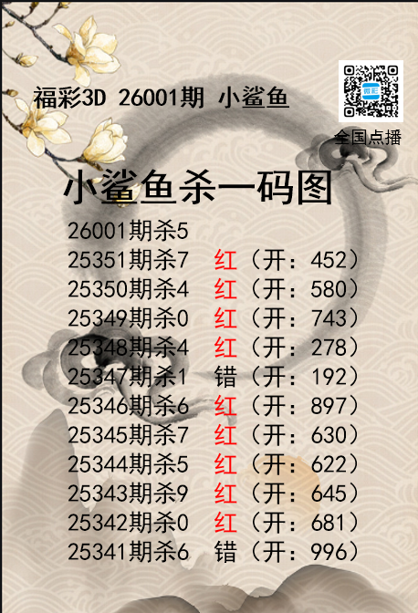 福彩3D26001期分析师小鲨鱼杀号图精 发表于:2026-01-01 16:53:04 浏览次数:823 上一篇:福彩3D26001期码师小贝杀号图精选 下一篇:福彩3D26001期财神送彩杀三码 福彩3D定位5荣誉榜