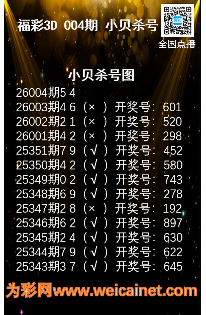 福彩3D26004期码师小贝杀号图精选 发表于:2026-01-04 18:48:54 浏览次数:746 上一篇:福彩3D26004期胆码 蓝电耗子三胆图 下一篇:福彩3D26004期分析师小鲨鱼杀号图精 福彩3D定位5荣誉榜