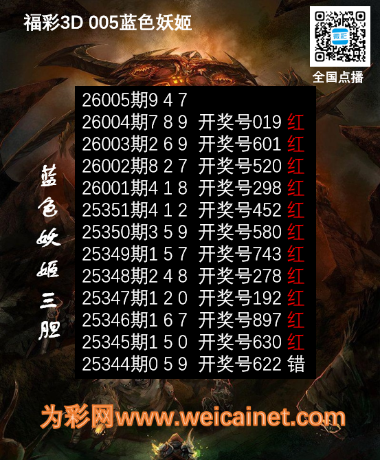 福彩3D26005期胆码 蓝色妖姬胆码图 发表于:2026-01-05 18:24:46 浏览次数:765 上一篇:排列三26005期孙膑预测三胆 下一篇:福彩3D26005期胆码 吸血鬼双胆图 福彩3D定位5荣誉榜