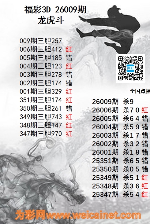 福彩3D26009期龙虎斗胆码 杀码图 发表于:2026-01-09 16:35:51 浏览次数:785 上一篇:福彩3D26009期财神送彩杀三码 下一篇:福彩3D26009期鲸落万物生胆码推荐 福彩3D定位5荣誉榜