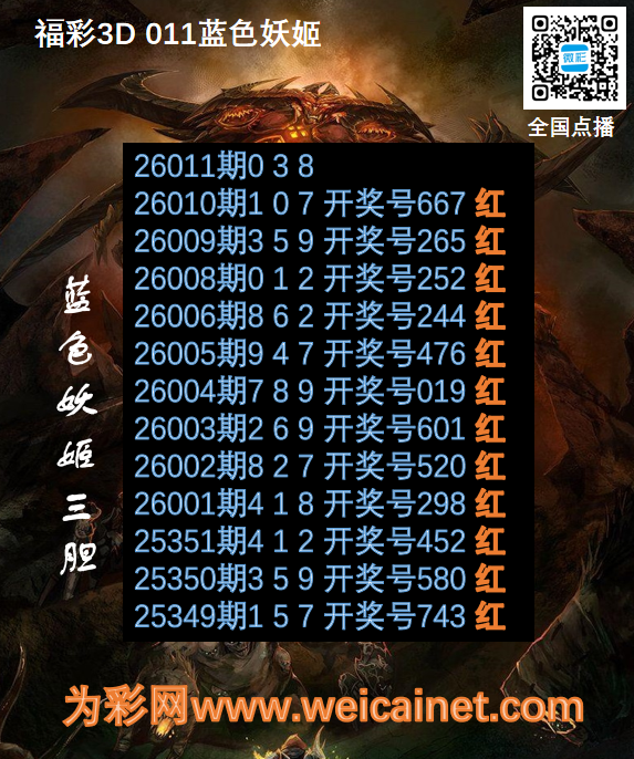 福彩3D26011期胆码 蓝色妖姬胆码图 发表于:2026-01-11 15:59:12 浏览次数:394 上一篇:26011期: 福彩3D财神精选胆码杀码 下一篇:福彩3D26011期胆码 吸血鬼双胆图 福彩3D定位5荣誉榜