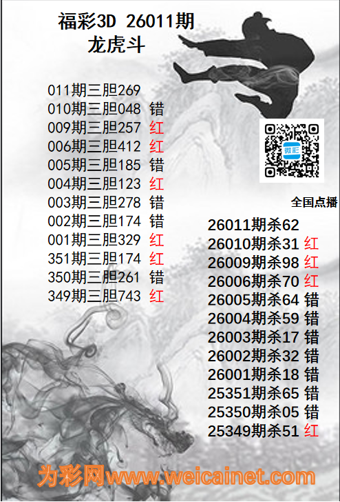 福彩3D26011期龙虎斗胆码 杀码图 发表于:2026-01-11 16:29:49 浏览次数:1360 上一篇:福彩3D26011期鲸落万物生胆码推荐 下一篇:福彩3D26011期财神送彩杀三码 福彩3D定位5荣誉榜