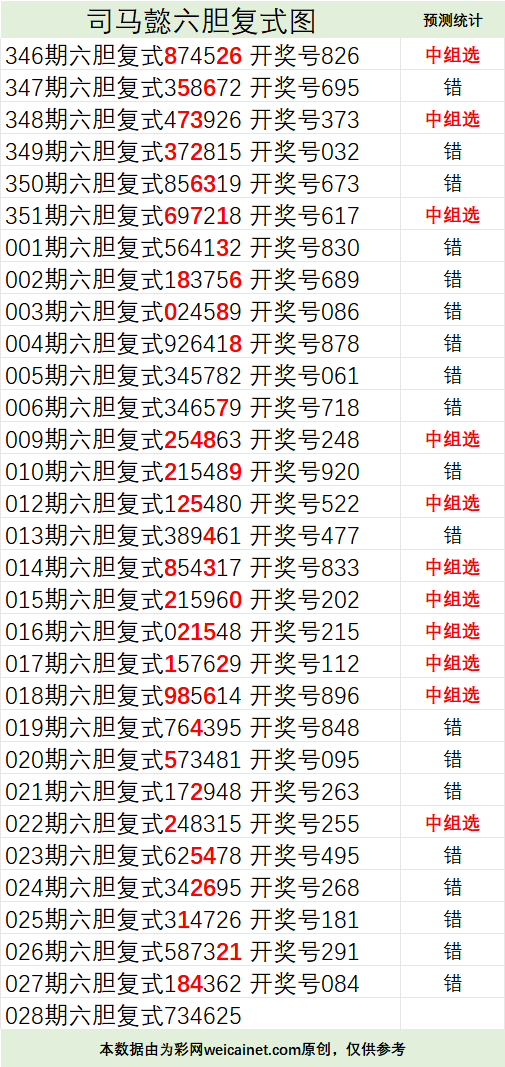 排列三26028期司马懿六胆复式预测图 发表于:2026-01-28 16:53:21 浏览次数:784 上一篇:排列三26028期 张飞定位杀两码 下一篇:排列三26028期胆码 周瑜定位五胆图 福彩3D定位5荣誉榜