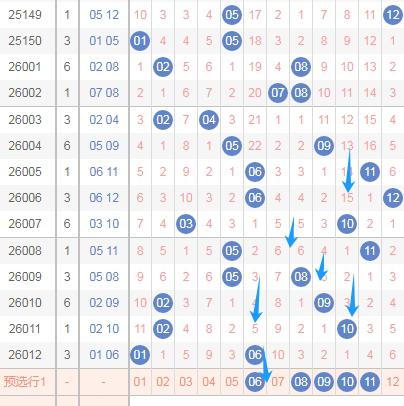 上图是体彩大乐透后区开奖号码分布图,我在上面图中标注出来的数字是我觉得后区第二个数字该出的范围,上面走势图中标注出来的蓝色箭头表示的就是后区第二个数字最近开出的遗漏周期,上期开出数字06遗漏周期5期,看上面的遗漏周期,本期我觉得后区第二个数字开遗漏周期小的数字概率要大,所以后区第二个数字范围定06 08 09 10 11。