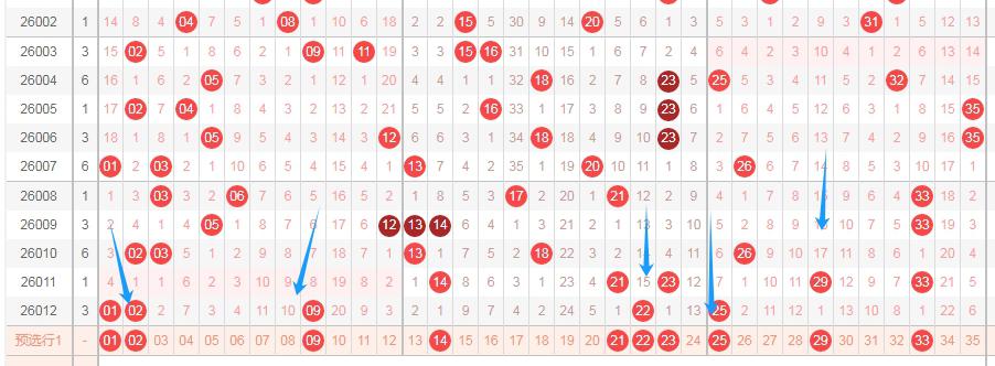上图是体彩大乐透前区开奖号码走势图,我在上面走势图中标注出来的数字都是重复号码和隔一期的数字,你们看上面走势图中标注出来的蓝色大箭头就知道,最近两期开出的号码的遗漏周期大的居多,那么前面开出遗漏周期大的号码居多,那么本期开出遗漏周期小的数字的概率就大,本期关注这些重复号码和隔一期的数字至少出1个或者2个吧,关注数字01 02 09 14 21 22 23 25 29 33出1个或者2个,3个的概率要低一点。