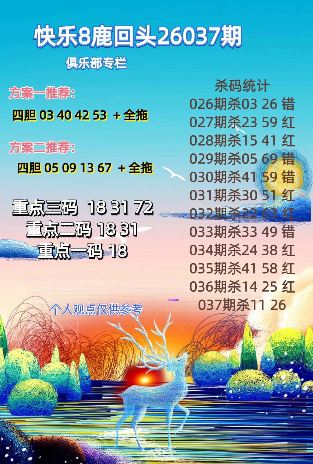 快乐8 26037期鹿回头杀码统计图 发表于:2026-02-06 11:59:45 浏览次数:481 上一篇:福彩3D26037期藏机图诗句 3D字谜汇总 下一篇:九宝图26037期福彩3D寻码图 快乐8复式荣誉榜