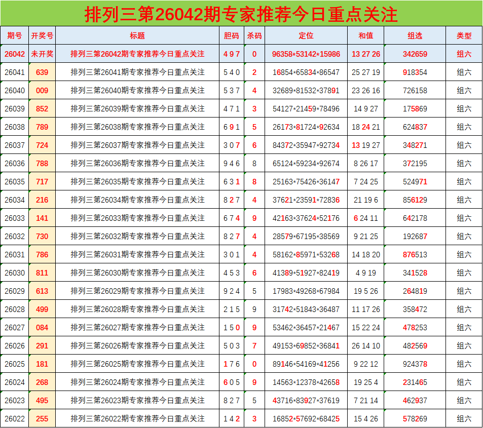 排列三26042期胆码预测分析 专家推荐497 发表于:2026-02-11 17:10:54 浏览次数:883 上一篇:福彩3D 26042期复式定位统计 下一篇:排列三26042期二郎神杀号 绝情杀三码 福彩3D定位5荣誉榜