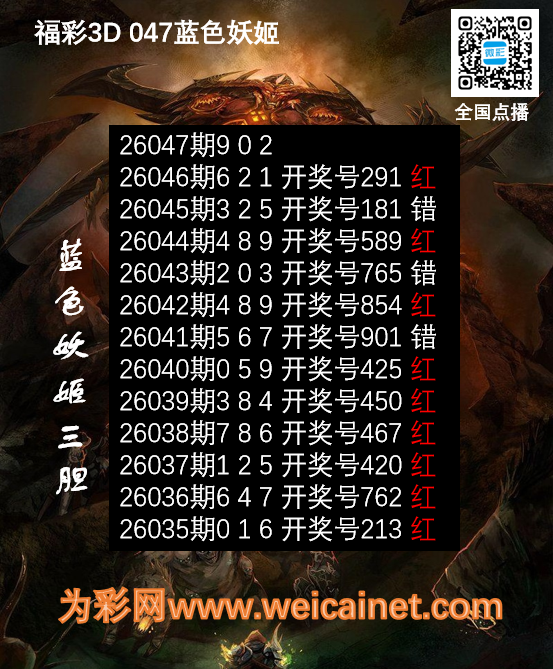 福彩3D26047期胆码 蓝色妖姬胆码图 发表于:2026-02-26 16:40:54 浏览次数:856 上一篇:排列三26047期孙膑预测三胆 下一篇:福彩3D26047期胆码 吸血鬼双胆图 福彩3D定位5荣誉榜