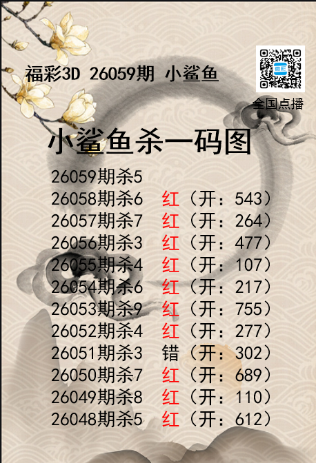 福彩3D26059期分析师小鲨鱼杀号图精选 发表于:2026-03-10 17:24:45 浏览次数:771 上一篇:福彩3D26059期码师小贝杀号图精选 下一篇:福彩3D26059期财神送彩杀三码 福彩3D定位5荣誉榜